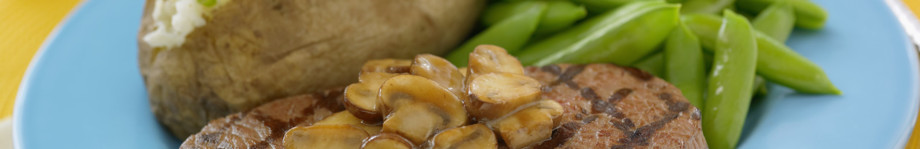 Medaillons vom Schweinefilet, mit frischen Egerlingen, Prinzessbohnen im Speckmantel und tournierte Kartoffeln